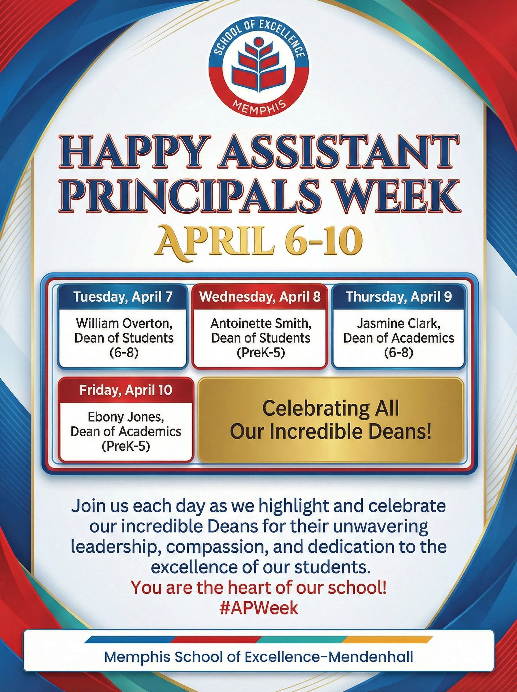 Esta semana, celebramos con orgullo a los increíbles líderes que ayudan a hacer de Memphis School of Excellence – Mendenhall un lugar donde los estudiantes pueden verdaderamente ¡ALZAR EL VUELO! 🦅